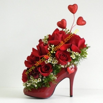 Hoa hồng đỏ luôn luôn cực kì nổi bật, cực kì quyến rũ, cực kì say đắm lòng người dù kết hợp với bất cứ ai à nhầm bất cứ loại hoa, loại cành trang trí nào phải không ạ.^^ Bất chấp bó tròn hay là cắm nghệ thuật, để lãng hoa hay để bình hoa, thì hoa hồng đỏ cũng là tâm điểm của mọi sự chú ý. Nên những bạn nào mê mẩn hoa hồng đỏ thì cực kì sung sướng ý nhỉ ^^ Và chiếc cao gót đỏ này thì cỉ có thể nói là quá tuyệt vời.