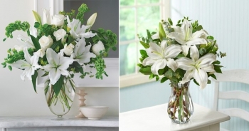 Khi cắm, bạn chọn hoa ly cùng chung một màu, những bông hoa phụ cũng có màu gần tông với hoa ly. Vì màu sắc gần nhau nên cách tốt nhất để đường nét hoa ly nổi bật là bạn dùng chính lá xanh cắm xen kẽ giữa các bông hoa. Kiểu cắm hoa này rất thanh nhã, nhất là khi bạn dùng màu trắng.