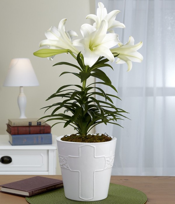 Chọn cành ly thật dài, nguyên củ càng tốt, cắm vào một bồn/chậu hoa nhỏ chứa đất hoặc xốp cắm hoa. Bề mặt bồn/chậu được phủ một lớp rêu giả thật tự nhiên như bạn đã trồng hoa từ lâu lắm. Một số người còn cắm hoa vào chính bồn cây thật của mình: đào các lỗ nhỏ trong bồn đất, để các ống thủy tinh lọt vào đó rồi đổ nước để cắm hoa, sau cùng phủ rêu bề mặt để ngụy trang. Kiểu cắm hoa này rất tự nhiên vì bạn đã giữ nguyên toàn bộ nét đẹp vốn có của cành hoa ly.