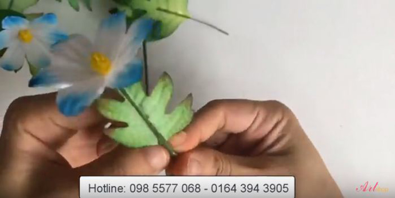 Bước 4: Dùng keo sáp quấn lá vào cành hoa đồng thời nối thêm 1 đoạn cành nữa để cành hoa dài hơn.