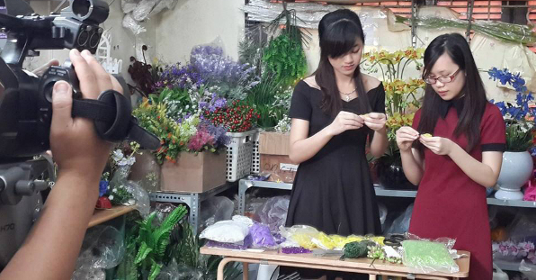 Bạn Đặng Thu Hằng đang dạy làm hoa pha lê cho học viên - Phóng sự của Đài truyền hình AVG