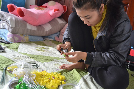 Chị Hương đang ngồi xâu các cánh hoa pha lê